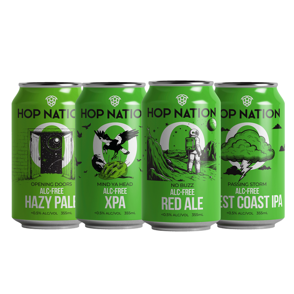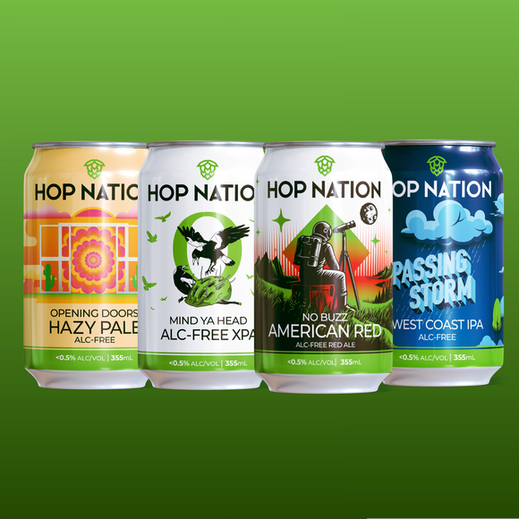 Starting with our Alc-Free Hazy Pale, Opening Doors (<0.5% ABV) we are changing our cans to the easy to recognise in Hop Nation Green. This change is happening over the next few months. Names will stay the same and you’ll slowly see the the new cans in your online orders.