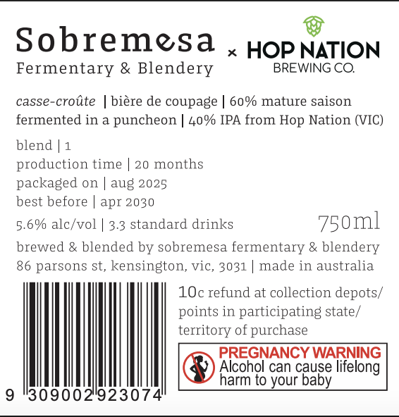 casse-croûte | bière de coupage | 60% mature saison fermented in a puncheon | 40% CHOP IPA from Hop Nation (VIC) | 5.6% abv